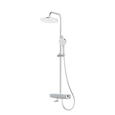 Хромированный смеситель для ванны с верхним душем Shelfy с дизайнерским корпусом с декоративными элементами из закаленного стекла и стильными белыми вставками. Технологичное и понятное кнопочное управление Push Control. Регулировка комфортной температуры воды производится поворотом ручки.