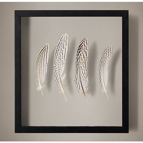 Натуральные птичьи перья специально собраны и отсортированы для создания коллекции декора Framed feather. Красоту их окраса подчеркивает простой льняной фон рамки-витрины (шэдоубокс). Для подвешивания на стену сзади предусмотрены 2 кольца D-образной формы. Рамки с перьями потрясающе смотрятся "сольноо", однако в группе они производят наиболее драматичный эффект.