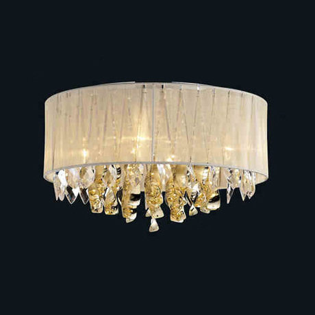 Потолочный светильник из коллекции Aura на арматуре из нержавеющей стали. Плиссированный текстильный плафон белого цвета. Декор: множество прозрачных, золотых и черных подвесок.