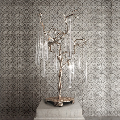 Настольная лампа из коллекции Aqua на арматуре серебряного цвета. Дизайн выполнен в виде дерева со сплетением ветвей. Сверкающие подвески-капли из муранского стекла на ветвях. Возможны другие варианты по цвету стекла и покрытию металла. Идеальные пропорции и изящные линии сочетают в себе классические традиции и новаторство нашего времени. Все изделия Serip изготавливаются вручную, имеют органичные формы и цвета, вливаются в интерьер, делая его утонченнее и ярче.