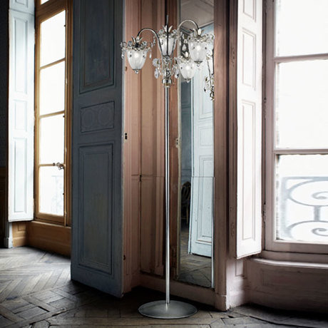Торшер серии RUGIADA имеет металлическую основу покрытую фольгированным серебром. Три световых элемента размещены под элегантными плафонами из муранского стекла ручной выдувки. Светильник декорирован цепочками и подвесками из прозрачного хрусталя. По индивидуальному заказу возможны различные модификации и варианты отделки.