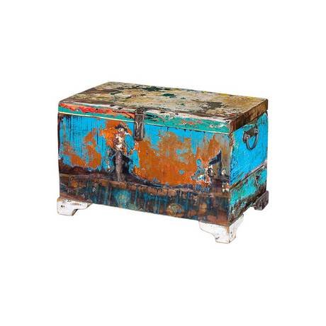 Сундук для хранения вещей, выполненный из старой рыбацкой лодки с сохранением оригинальной многослойной окраски.